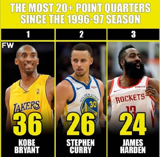北京时间11月5日消息,美媒体统计了1996-97赛季至今的球员单节得分20+次数,洛杉矶湖人已故巨星科比-布莱恩特高举这份榜单的第一名,排在第二的是勇士当家史蒂芬-库里,火箭球星詹姆斯-哈登则位列第三。