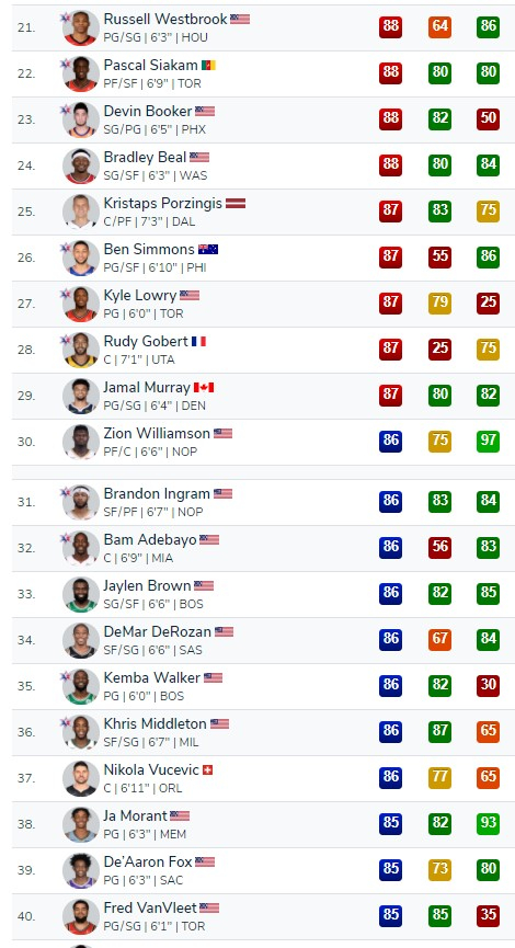总评达到90以上的一共有15名球员,分别为:詹姆斯、字母哥、莱昂纳德、哈登、杜兰特、浓眉哥、利拉德、库里、东契奇、巴特勒、恩比德、塔图姆、约基奇、唐斯和欧文。