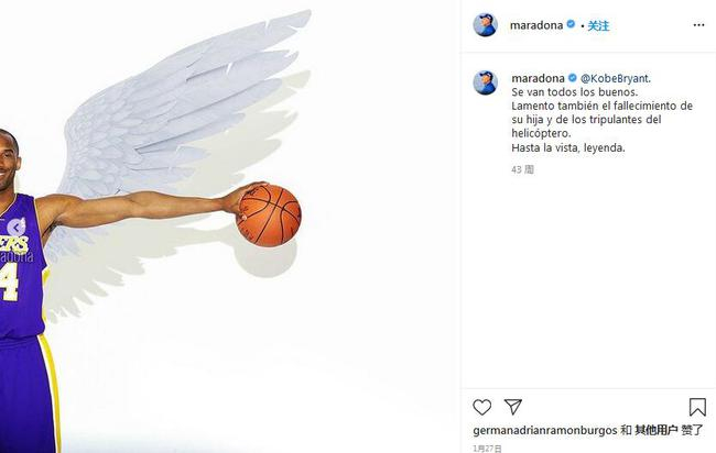 科比遇难那天,马拉多纳在IG上向科比和家人表达了哀悼:“科比,我曾在布宜诺斯艾利斯见过你。我也为科比的女儿以及同乘人员的遇难感到遗憾。再见,传奇。”并且在IG上配上一张带着翅膀的科比照片。