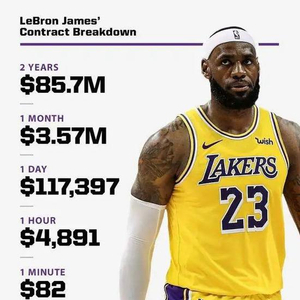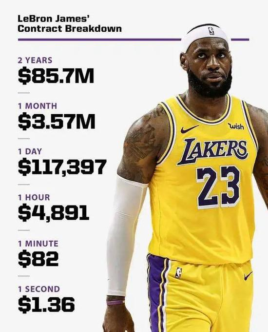 拿到5年1.95亿的顶薪(触发激励条款的情况下)三旬老汉勒布朗也得到了湖人队史的第一个4000万美元