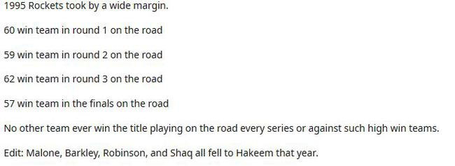1995年的火箭创造了一项纪录:他们是NBA历史上常规赛排名最低的总冠军,在西部只排在第六位。在四轮系列赛中,他们每一轮都没有主场优势。相应的,他们遇到的四个对手的战绩,也是NBA历史上历届冠军中最好的。