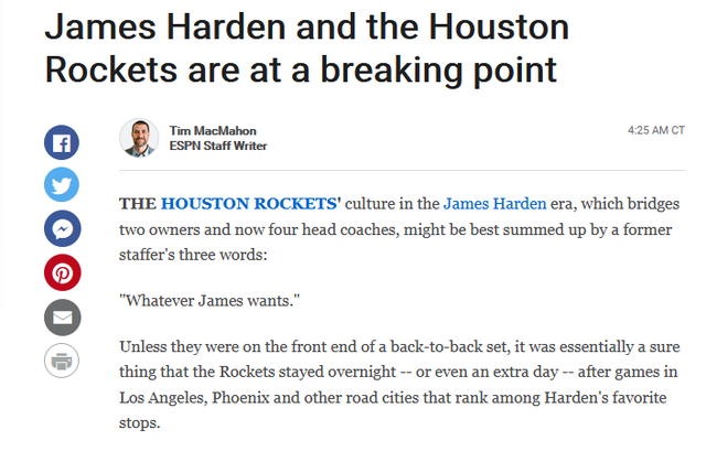 “我们都知道火箭队真正的老大是谁。”一位不愿透露姓名的前火箭队助教在接受采访时说道,“火箭队的球员们、教练们、总经理和老板都知道。我不责怪詹姆斯-哈登,我责怪球队。这不是哈登的错,他这么做是因为火箭队允许他这么做。”