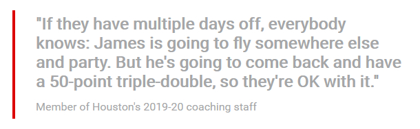 “如果他们(火箭队)有许多天的休息,每个人都知道:詹姆斯(哈登)将会去其它城市参加派对。但是他回来之后可以得到50分三双,所以火箭队对此没有问题。”上赛季火箭队教练组里的一位成员表示。
