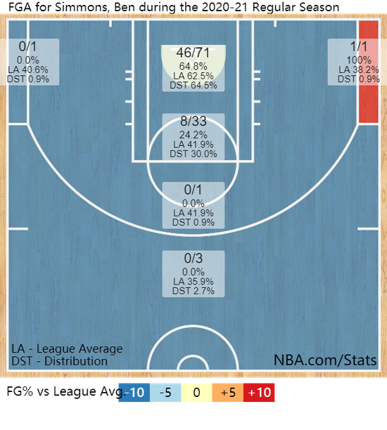 如果不能投篮已经是西蒙斯撕不掉的标签,那也罢了,起码把自己的长处打出来啊?西蒙斯也做不到,他的近框终结越来越差,本赛季在禁区之内,合理冲撞区之外,大概距离篮筐4尺-14尺的距离,西蒙斯只有33投8中,命中率只有24.2%,全联盟这个区域场均出手2次的球员里,只有巴顿,怀斯曼和威少比他更铁。上个赛季在同样的区域,他好歹还有34.1%的命中率,就连合理冲撞区内的命中率他也从上赛季的68%滑落到64.8%,被盖帽率从5%增加到13%。