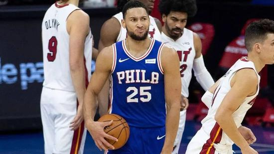 在对阵篮网赛后,西蒙斯抱怨他左膝肿胀,缺席了接下来的两场比赛,然后在对阵迈阿密的比赛中,他打出生涯最糟的表现。32分钟只出手两次,曾经坚如磐石的防守也消失不见。上赛季他先是腰伤,又在季后赛来临之前左膝肿胀,我们并不知道现在的西蒙斯,身体状况有没有恢复到完全健康的状态,比赛中也可以明显看出他的速率,弹跳都不及当年,以前迎着对抗就能造2+1,现在则躲着防守还打不进。