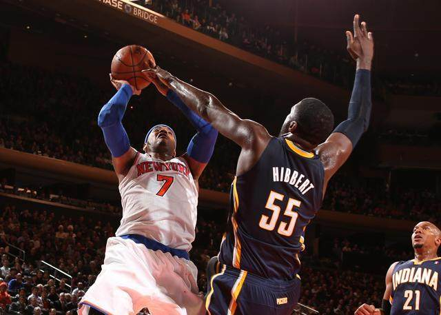 当时,尼克斯还领先对手两分,安东尼接球转身过掉了乔治,冲击篮筐,却被希伯特一记大帽狙击。