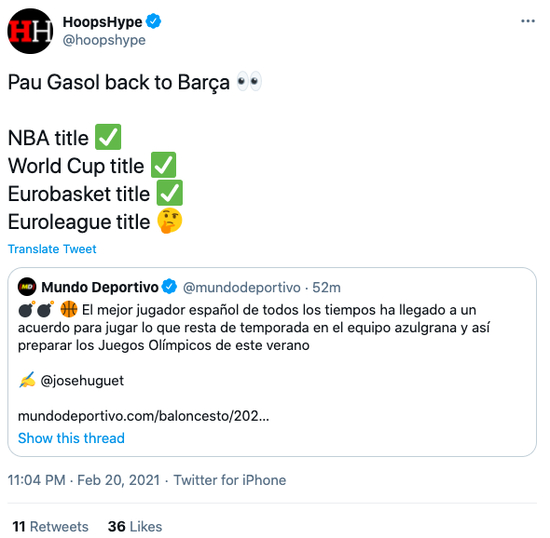 此前西班牙《世界体育报》报道,前NBA球员保罗-加索尔与西班牙巴塞罗那俱乐部签约,并将为球队打完赛季剩下比赛,为今年奥运会做准备!