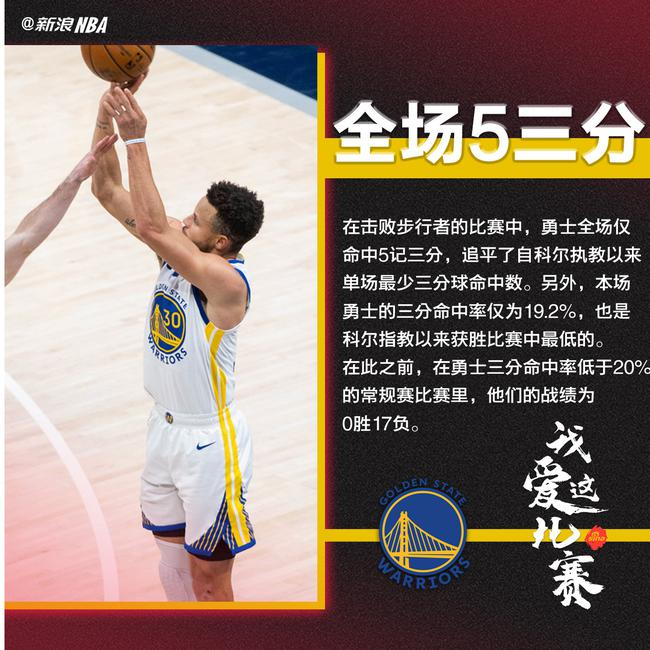 这个26投5中的三分,追平了自科尔执教以来单场最少三分球命中数,另外,本场比赛,勇士的三分命中率仅为19.2%(26投5中),是科尔指教以来获胜比赛中最低的。