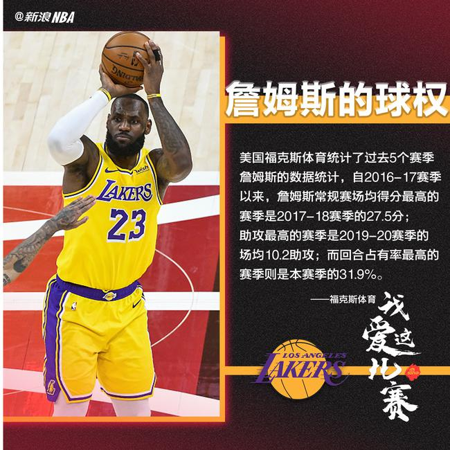 自2016-17赛季以来,詹姆斯常规赛场均得分最高的赛季是2017-18赛季的场均27.5分;助攻最高的赛季是2019-20赛季的10.2助攻;而回合占有率最高的赛季,则是本赛的31.9%。