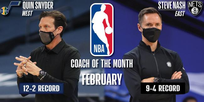 北京时间3月3日,NBA今天宣布了2月东西部最佳教练,篮网队主帅史蒂夫-纳什和爵士队主帅斯奈德当选。