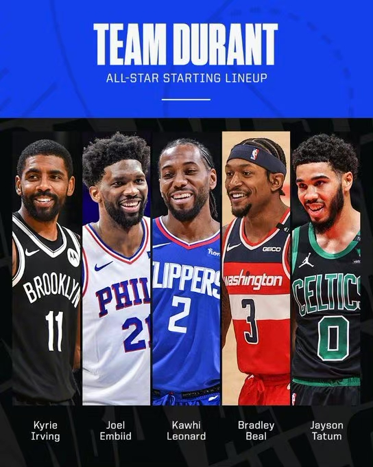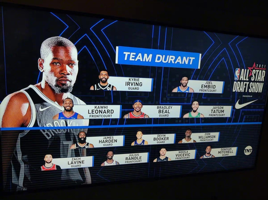 杜兰特队首发:欧文、恩比德、小卡、比尔、塔图姆。(人是KD选的,但他因伤打不了。。。)