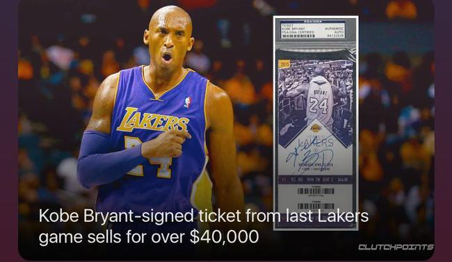 当时,在2016年4月13日,18997名付费观众有幸见证了科比在洛杉矶湖人队的最后一场NBA比赛。其中,一位球迷有幸得到了科比的签名,据TMZ报道,一张科比历史性比赛的门票在收到42份竞价后,在戈尔丁拍卖行以40590美元的价格售出。值得一提的是,这张票是302区2W排2号座位的,买家目前还不清楚。