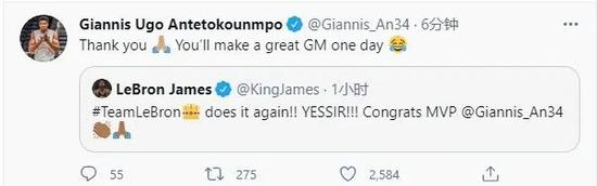 字母哥转发回复詹姆斯:“谢谢!总有一天你会成为一名优秀的球队总经理。”