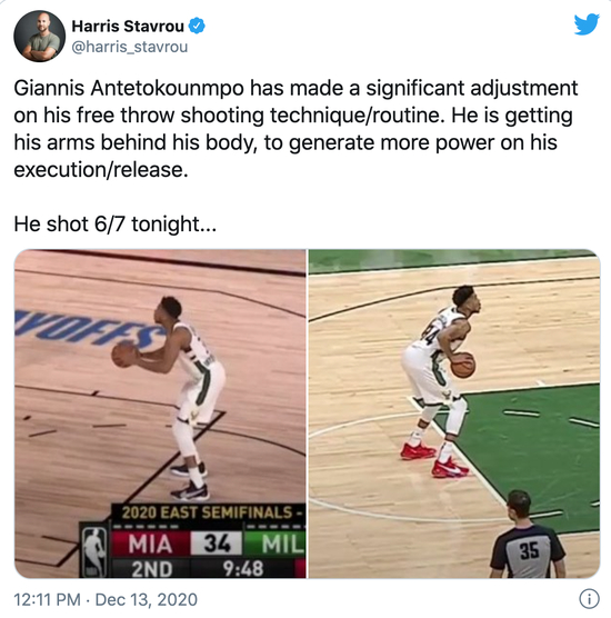 字母哥也尝试过改变自己的罚球姿势,当地记者哈里斯-斯塔沃就指出,今年字母哥的罚球起手式变为在身体右侧下方开始抬起,而从前他是直接放在胸前出手。