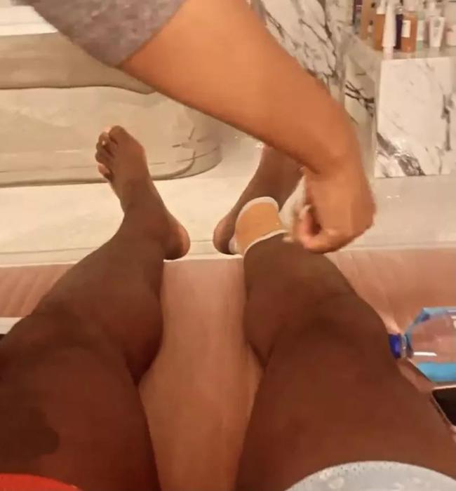 当时,詹姆斯躺在家中自拍,他的扭伤的右脚踝缠绕绷带,而詹姆斯的妻子Savannah似乎在丈夫的右小腿上做一些清洁工作。