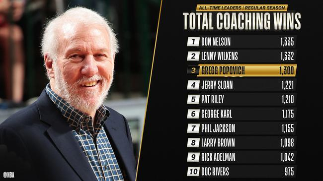 这是波波维奇执教取得的第1300场NBA常规赛胜利,他也成为了NBA历史上第三位取得1300场常规赛胜利的主帅,仅次于老尼尔森(1335场)和兰尼-威尔肯斯(1332场)。