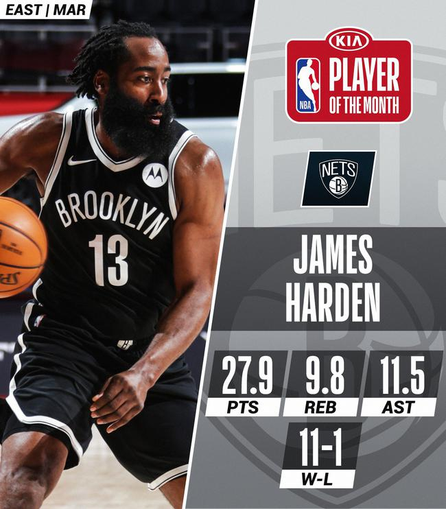 北京时间4月2日,NBA官方公布了三月份的月最佳球员,东部月最佳球员由篮网超巨詹姆斯-哈登获得。