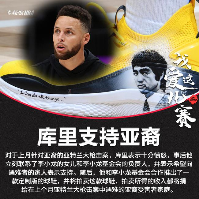 库里和李小龙基金会合作推出了一款定制版的球鞋,而库里计划在未来几周里拍卖这款球鞋,拍卖所得的收入都将捐给在上个月亚特兰大枪击案中遇难的亚裔受害者家庭。