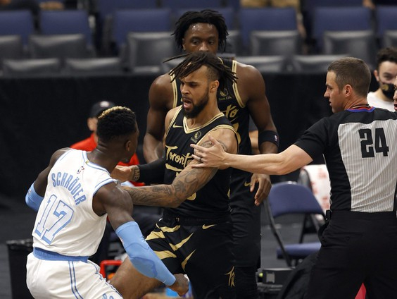 7日对湖人的比赛,猛龙输得很惨。而且在场上发生了冲突,新加盟不久的加里-特伦特与丹尼斯-施劳德互相推搡,导致两队球员纠缠在一起。最后OG-阿奴诺比和蒙特雷斯-哈雷尔遭到驱逐。