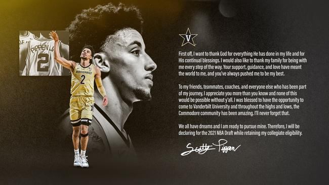 上赛季,皮蓬二世在范德堡大学场均得到20.8分、4.9次助攻和1.8次抢断。