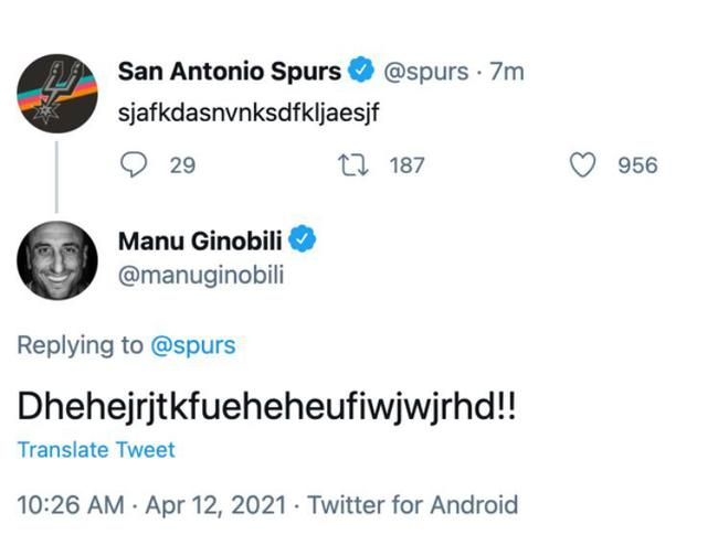 马刺官推发出了一长串的乱码:“sjafkdasnvnksdfkljaesjf”。而吉诺比利同样在看到德罗赞的这记准绝杀之后发出乱码:“Dhehejrjtkfueheheufiwjwjrhd!!”
