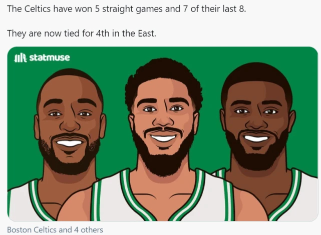 目前,凯尔特人与排名东部第四的老鹰战绩相同。不过,双方因为胜负关系,凯尔特人暂时排名东部第五。