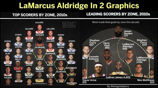 在整个2010年代,他在半场内的四个区域都这是联盟得分最多的球员。即使在本赛季,阿德在全联盟80次以上中距离出手的球员中,命中率也排到了第三名,仅次于约基奇和欧文。