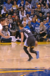 面对库里毫无怯色,用胯下加连续的背后运球晃过了库里,然后直冲篮下双手暴扣!