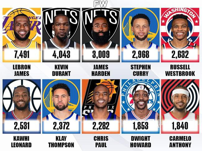 詹姆斯不但是现役球员的季后赛总分第一,其实也是NBA历史的季后赛得分王,而在他之后,杜兰特和哈登这两位队友分列二三位,库里和威少则是排名第四第五。