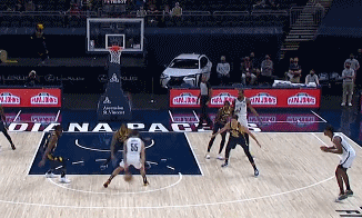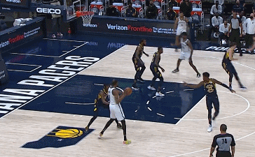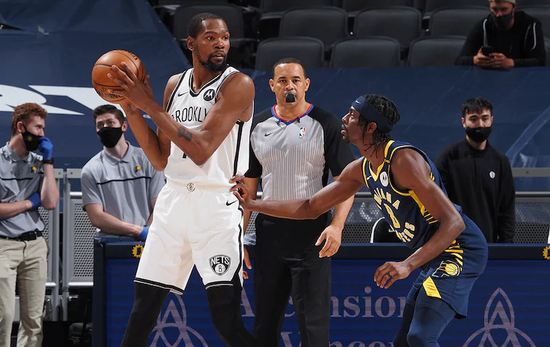 同样拿今天面对步行者的比赛为例,KD就不停的在用自己牵扯出来的巨大空间为队友创造机会,他只需要在中距离的区域吸引夹击,就可以用长臂轻松将球送到空位。