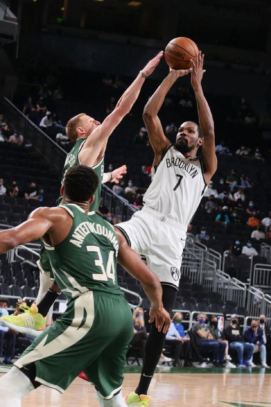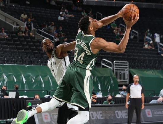 被字母哥直接盖掉阿杜的急停后仰跳投。