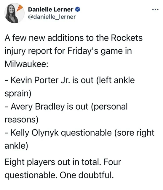 明天对战雄鹿的赛前,火箭也列了新增的伤病情况。