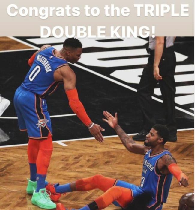 在社交媒体上,乔治写道:“祝贺三双王!兄弟是山羊@威斯布鲁克”要知道,在今天的比赛中,威少砍下三双数据,他也成为了历史上的三双王,超越大O。