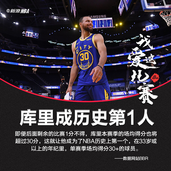 数据统计显示,在距离常规赛结束还剩3场比赛的情况下,库里本赛季的总得分已经达到了1948。即使库里最后三场比赛一分不得,他的场均得分也达到了30.4分。