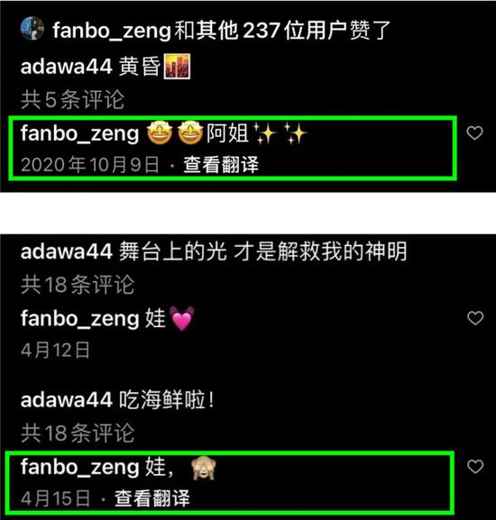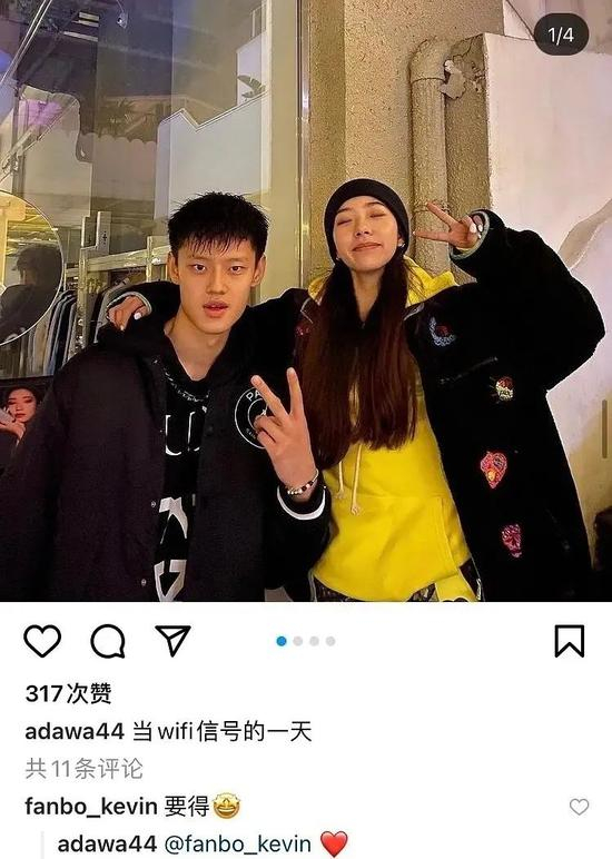 阿达娃在个人Ins晒出多张两人的亲密合作,并配文:当WiFi信号的一天。曾凡博也在下面留言评论:要得,阿达娃回了一个小心心。
