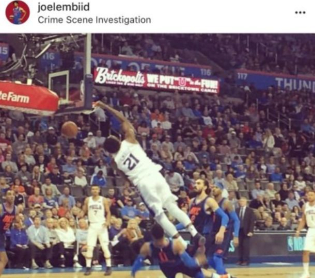 恩比德输了比赛,脸色不好看。但赛后他找到反击的机会,在网上转发他暴扣威斯布鲁克的照片,并配上评论:犯罪现场调查。