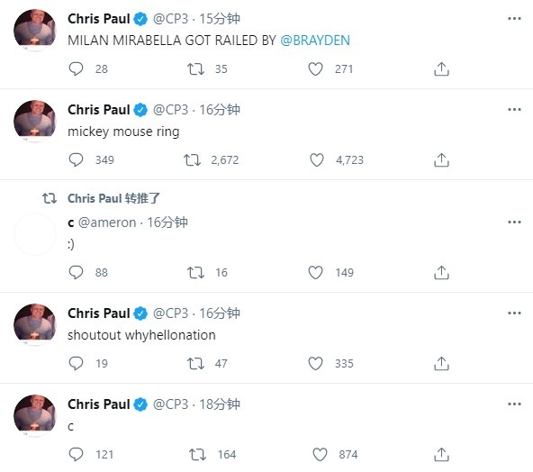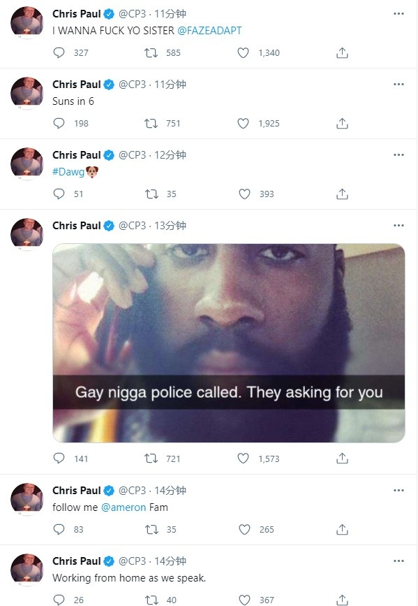 赛后,太阳球星克里斯-保罗的个人推特号被盗,随后的20分钟时间,盗号者已经发布了超过20条推文,并且修改了账号的头像。