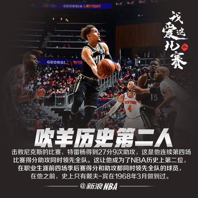 赛后据美国媒体的统计,这让杨成为了NBA历史上第二位,在职业生涯前四场季后赛得分和助攻都同时领先全队的球员。在他之前,只有名人堂成员戴夫-宾在1968年3月做到过这一点。