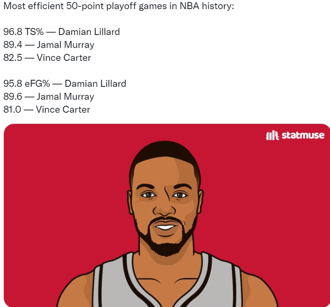 利拉德在本场比赛中的真实命中率达到96.8%,这放在NBA的历史上是排名第一的。排名第二的是贾马尔-穆雷;排名第三的是文斯-卡特的82.4%。