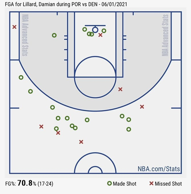 北京时间6月2日,波特兰开拓者以140-147不敌丹佛掘金,此役,开拓者球星利拉德24投17中,三分球17投12中,轰下55分6篮板10助攻。赛后,美媒分享了利拉德本场比赛的投篮图。