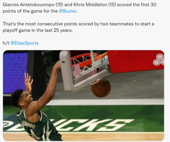 在今天的比赛中,字母哥和米德尔顿拿下了球队的前30分,字母哥得到15分,而米德尔顿也得到15分。根据美媒统计,这是近25年来两名队友在季后赛开局中连续得分最多的一次。