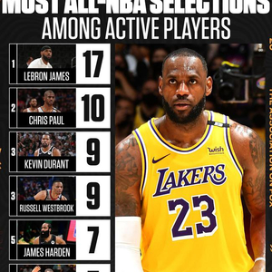 詹姆斯第17次入选NBA最佳阵容,NBA历史第一,当然也是现役第一。