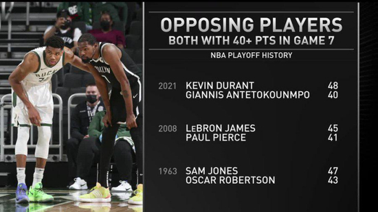 据统计,NBA历史上,这是第三次出现抢七战两队都有球员单场砍下40+的情况。