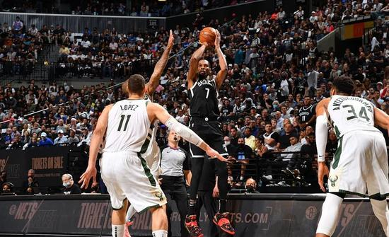不管雄鹿何时迫近或反超比分,杜兰特总能适时的出现,无情的用一个稳稳的中投或三分,维持着篮网场面上的优势。