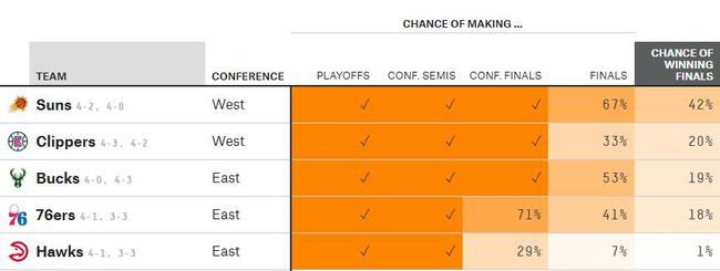 目前夺冠概率最大的球队是太阳,为42%;第二是快船,为20%;第三是雄鹿,为19%。