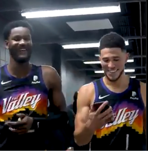 布克拿着手机,在过道中边走边跟保罗视频。德安德烈-艾顿在布克边上,凑过来说话,“嗨,哥们,你看到了吗?布克贡献了11次助攻。”说完,他跟布克都笑起来。