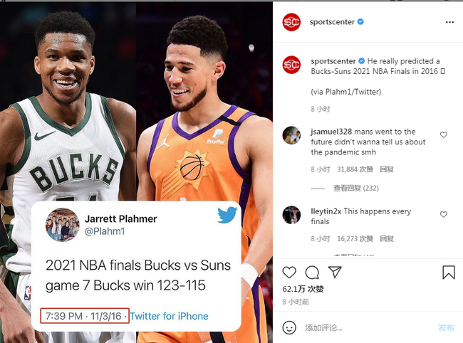 一位推特名为Jarrett Plahmer的网友当时在推特上写道:“2021年NBA总决赛,雄鹿vs太阳,抢七,雄鹿赢123-115”