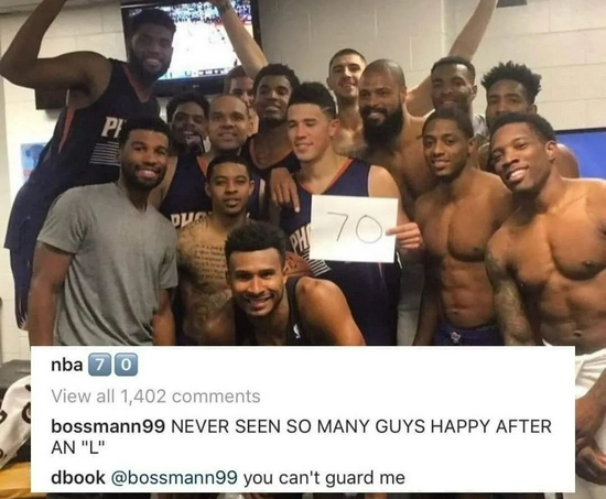看到这张照片被po到了社交媒体,该场比赛主防布克的克劳德第一个坐不住了,在下面评论道:没见过输球还这么高兴的人。