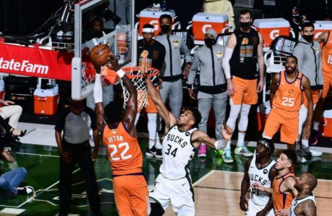 值得一提的是,当时在比赛还剩下1分15秒的时候,太阳进攻,布克持球突破内线高抛找到空位的艾顿,艾顿准备空接之时被字母哥补防大帽。(Emily)