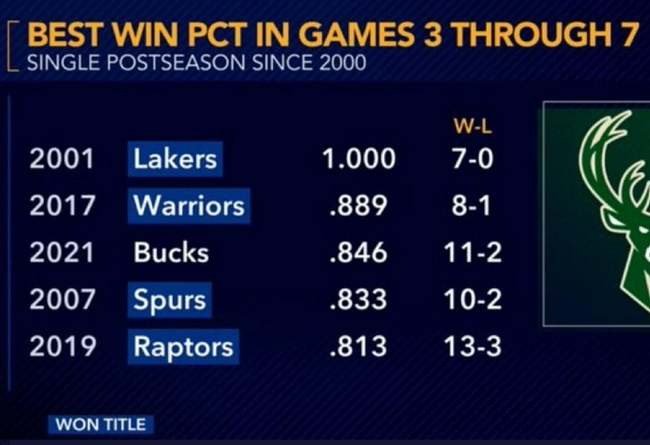雄鹿在对阵太阳和篮网的系列赛都是0-2落后开局。而如果只算他们G3-G7的所有战绩,雄鹿11胜2负,可以排在自2000年以来NBA单赛季胜率的第三。